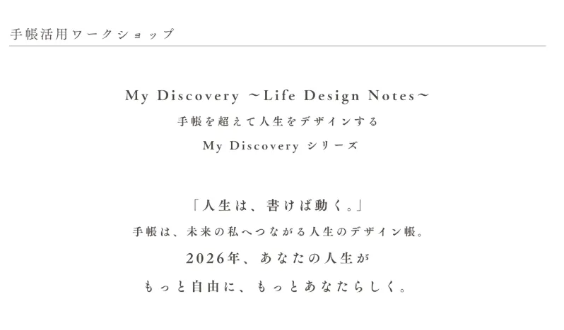 「My Discovery」は、SemiLatticeが提唱する自己探求型の手帳活用ワークショップです。このプログラムの中では、ただ予定を管理するだけでなく、自らの想いや価値観を明文化し、自分らしさを表現することに力点を置いています。参加者は、自身の内面と向き合いながら行動につながる小さな一歩を見つける機会を手にするのです。