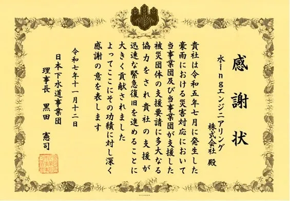 水ingエンジニアリング、豪雨災害への感謝状受賞
