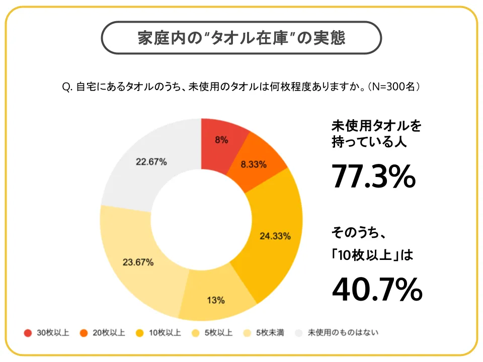 年末の大掃除の季節がやってきました。この時期に家の中を見直している人も多いことでしょう。その中で、普段あまり意識されないアイテムとして「タオル」が挙げられます。最近行われた調査によると、約77.3%の人々が未使用のタオルを持っていることが明らかになりました。タオルの利用実態について、以下で詳しく見ていきましょう。