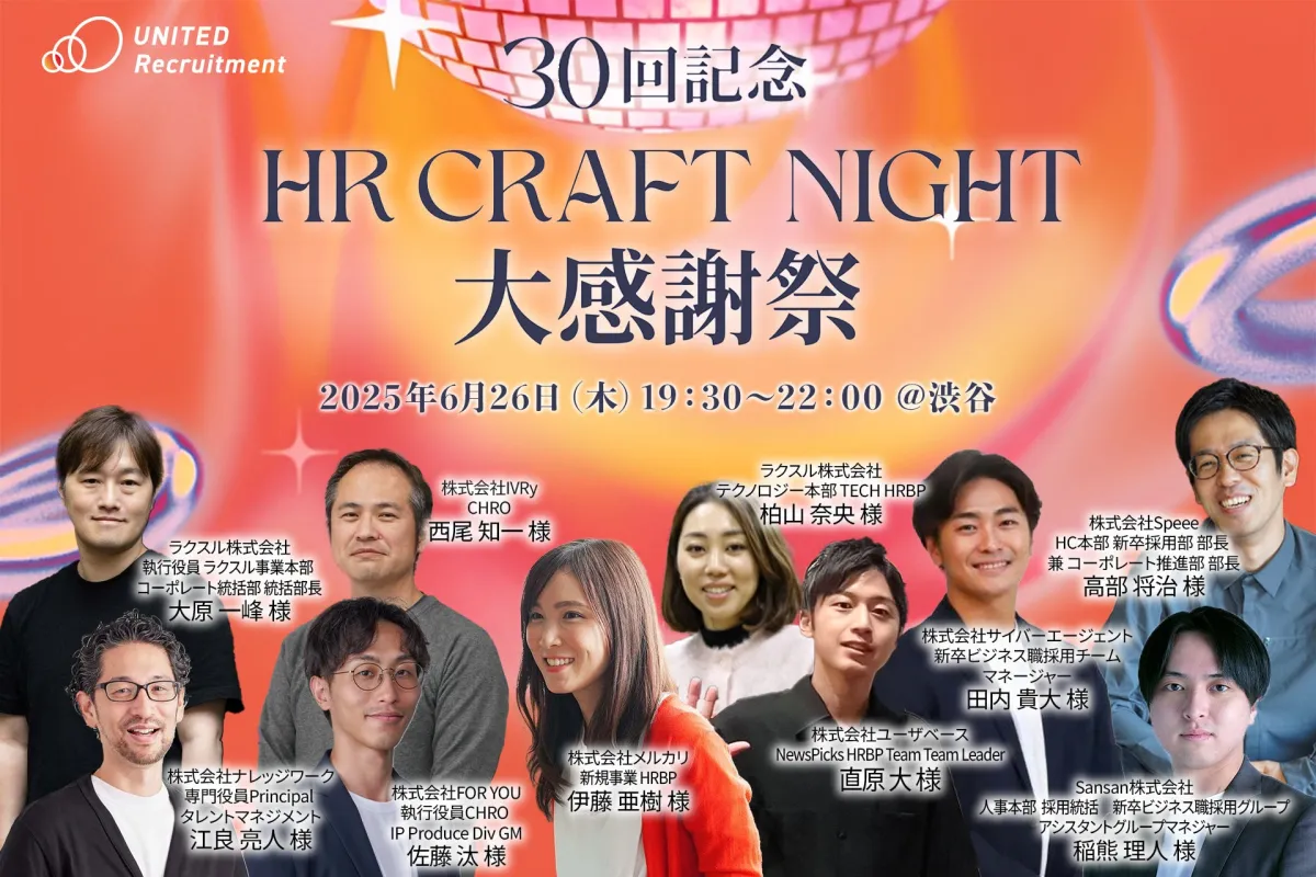 2025年6月26日、東京都渋谷区で開催される企業人事交流イベント「HR Craft Night 30回記念 大感謝祭」が注目を集めています。このイベントは、企業が人材採用や人事戦略についての知見を共有する場で、今年で30回目を迎える特別な機会となります。主催は、ユナイテッド株式会社の連結子会社、ユナイテッド・リクルートメント株式会社です。