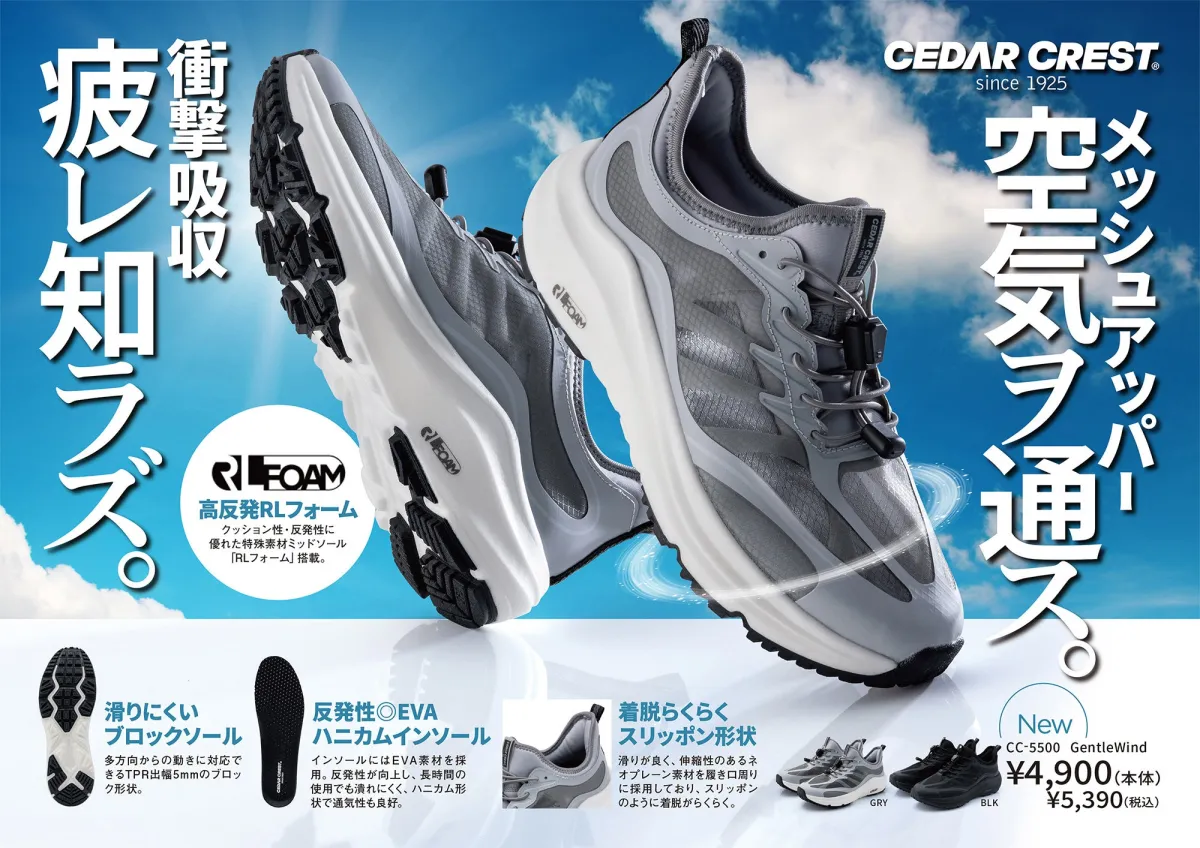 株式会社チヨダから、プライベートブランド「CEDAR CREST」より、高機能スニーカー「CC-5500 GentleWind」が発売されました。このスニーカーは、優れた通気性と衝撃吸収性能を持ち、これからの暑い季節にぴったりな一足となっています。