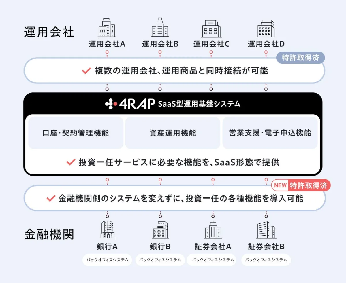 さらに、2024年には特許第7611791号を通じて、異なる運用会社との接続が可能になり、複数のラップサービスを同時に運用することができるようになります。これは、政府が進める「資産運用立国実現プラン」にも大きく寄与するもので、競争力を高めることができる新たな環境が整いつつあります。「4RAP」は、多様な金融機関が同一プラットフォーム上でサービスを展開できるため、業界全体の活性化にも貢献することが期待されています。