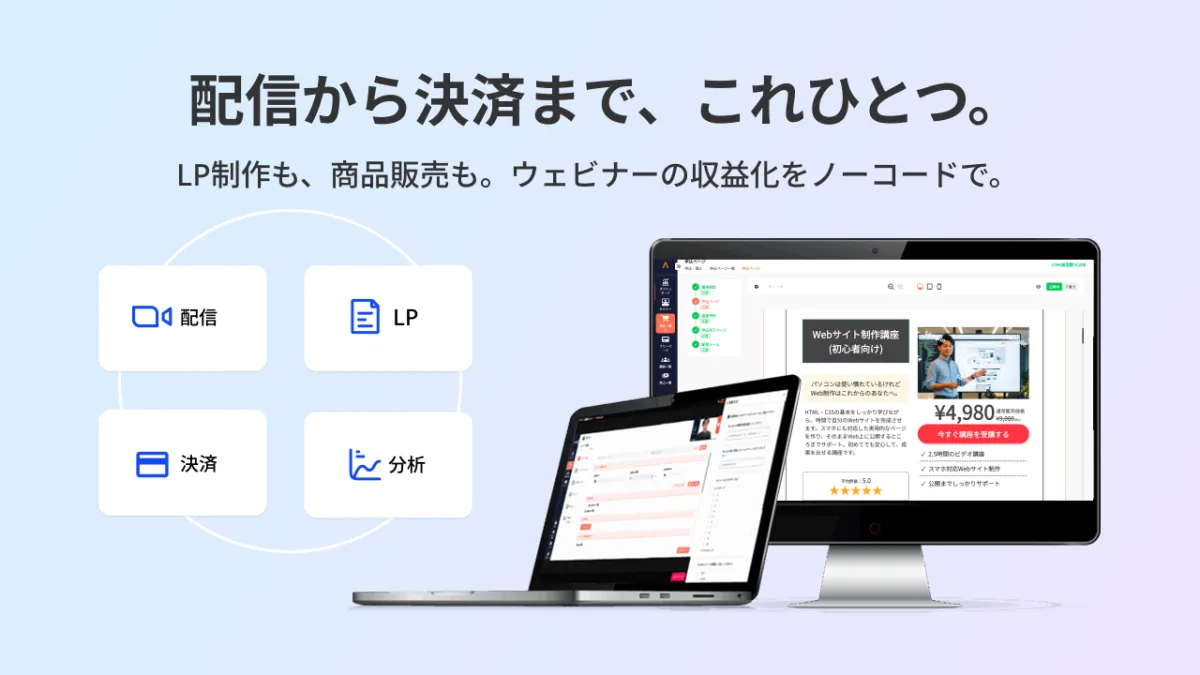 株式会社エックスラボが運営する「WebinarBase」は、マーケティング施策を強力に支援するウェビナーツールです。このたび、同サービスに新たにノーコードで商品やサービスの販売機能を持つランディングページ(LP)作成機能が追加されました。この機能により、ウェビナー運営者は従来の単なるセミナー申し込みページを超え、商品やサービスの販売に特化した収益化のためのページを構築できるようになります。