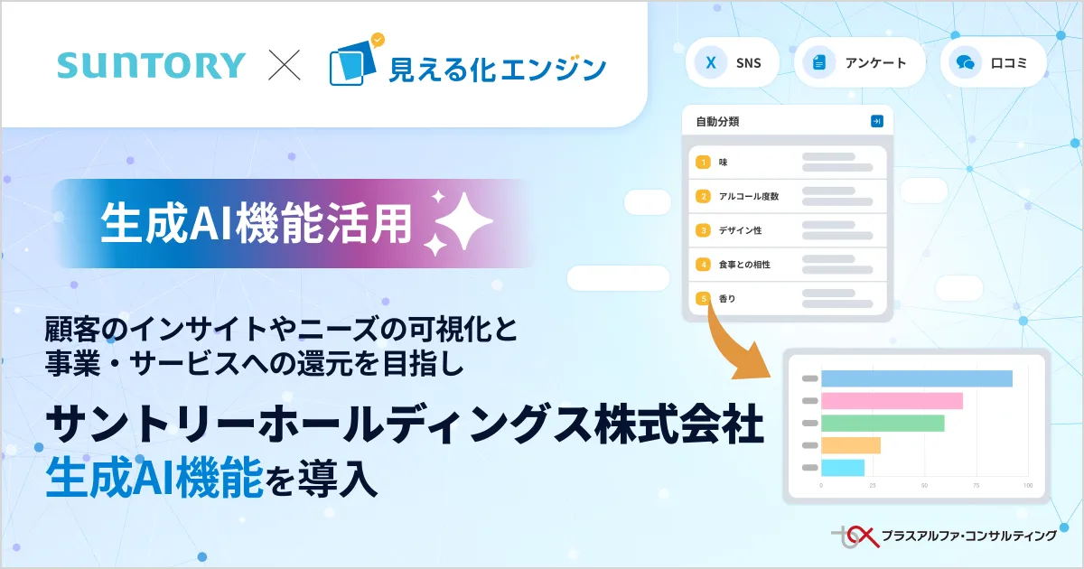株式会社プラスアルファ・コンサルティングが提供する生成AIを活用したビッグデータ分析ソリューション「見える化エンジン」の最新機能が、サントリーホールディングスに導入されることが決まりました。この取り組みは、顧客のニーズやインサイトを明確にすることを目指しています。