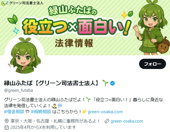 グリーン司法書士法人は、公式のX(旧Twitter)アカウント(