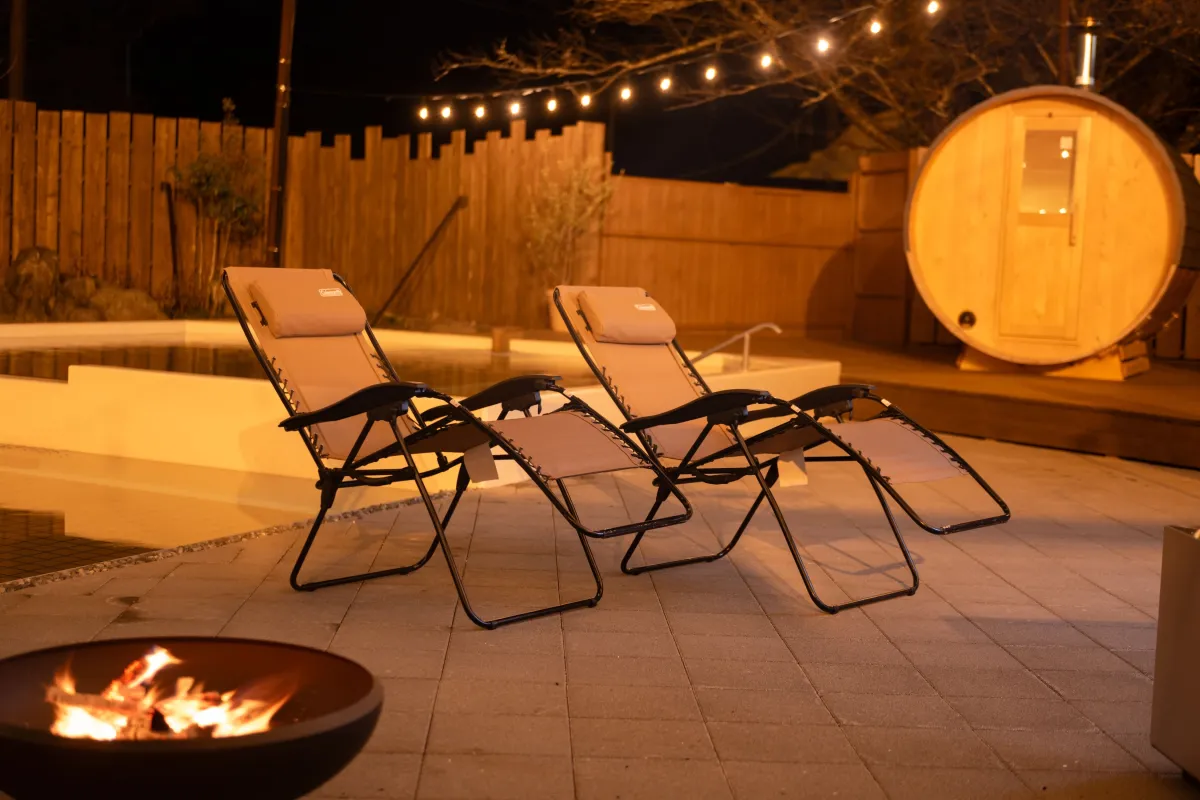 「KULTA」は、薪ストーブと電気ストーブのバレルサウナをそれぞれ2台と3台、特徴ある大型バレルサウナも含む、計5台を備えています。特に注目すべきは、14名まで利用可能な大型バレルサウナで、男女共用の水着やポンチョでの利用が可能です。心地よく汗を流した後は、深さが異なる二つの水風呂(120cmと60cm)で体をひやし、すっきりとした気分を味わえます。