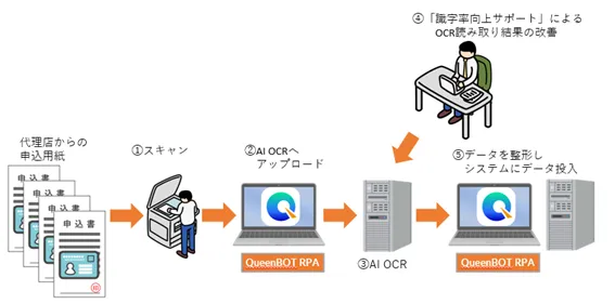 導入前の業務フローでは、オペレーターが受領した申込書を目視で確認し、手動でデータを入力する必要がありました。しかし、自動化後は、「QueenBOT RPA」とAI OCRによって、全ての工程が自動で処理されるようになり、業務効率は飛躍的に向上しました。