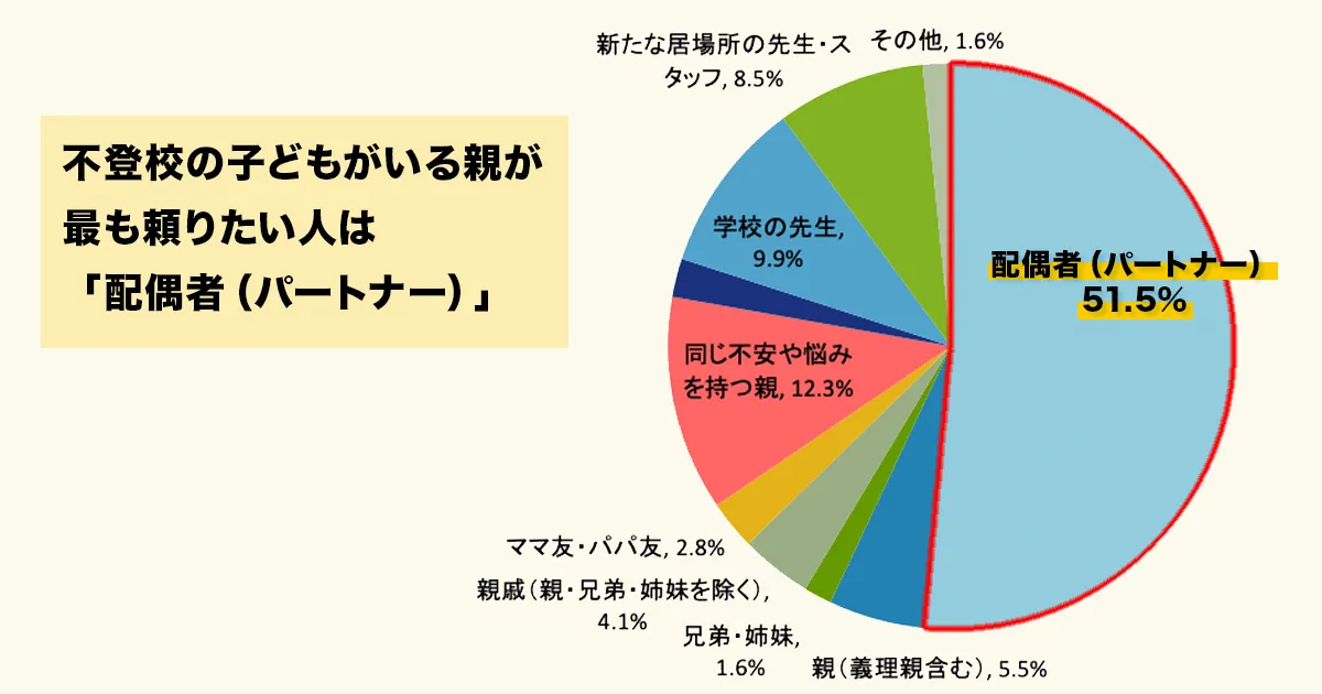 調査によれば、子どもが不登校になった場合に最も頼りたい相手は、配偶者(パートナー)であることが分かりました。自由回答では、「配偶者と意見が合わず、対応に苦労している」との声が多数挙がっています。この結果は、親同士のコミュニケーションを深める必要性を示しています。
