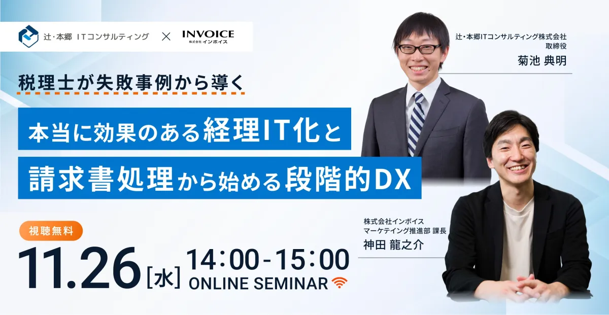2025年11月26日、水曜日の午後2時から、株式会社インボイスと辻・本郷ITコンサルティング株式会社が共催する無料オンラインセミナーが行われます。このセミナーでは「失敗事例から導く本当に効果のある経理IT化と請求書処理から始める段階的DX」というテーマのもと、経理業務のデジタル変革に関する貴重な情報が提供されます。