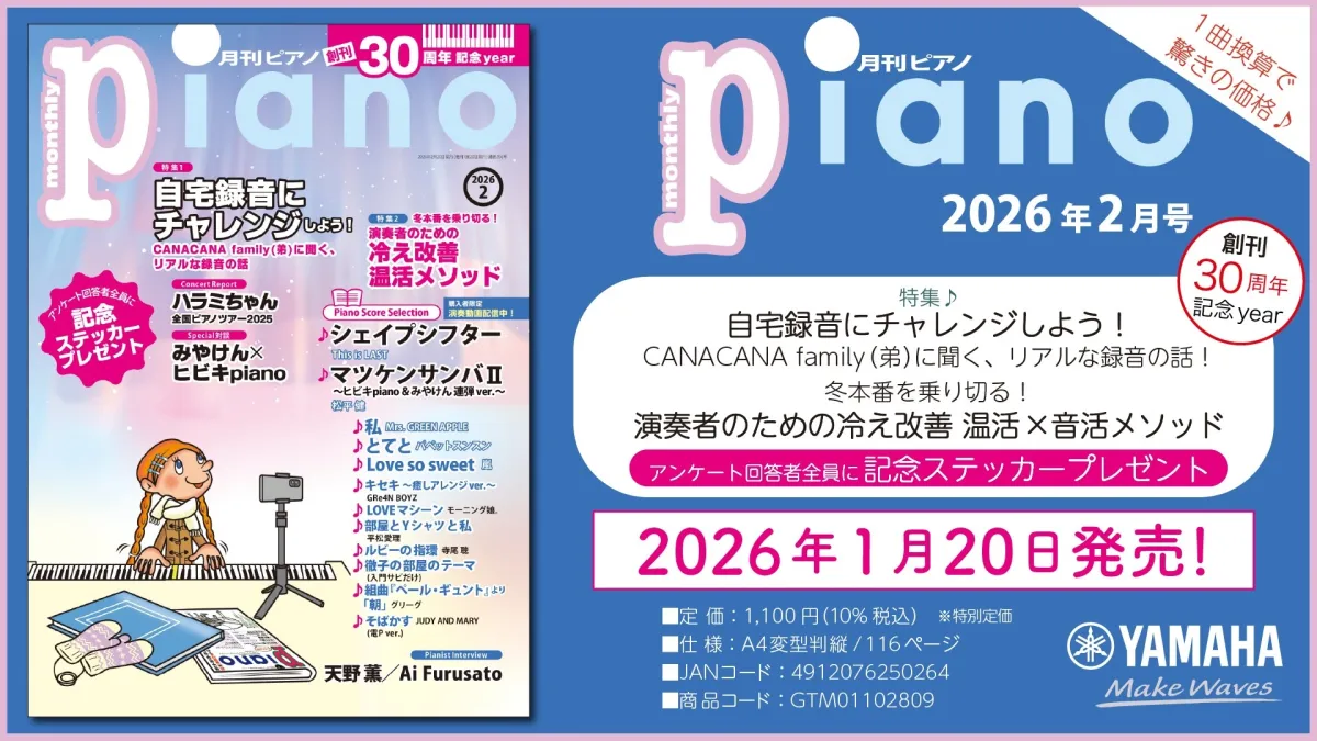 2026年1月20日に発売される「月刊ピアノ」2026年2月号は、同誌の創刊30周年を祝う特別な号となっています。この号では、自宅録音に挑戦するための特集と、楽器演奏者のための冷え改善メソッドを取り上げています。