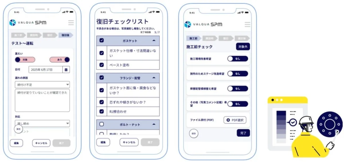 「VALQUA SPM」は、プラントの安定稼働を確保するための商品であり、日常的な保全から大規模な定期修理まで様々な保全業務を切れ目なくサポートします。進捗管理、翌日作業の申請、報告書作成機能が一体となっており、現場業務をスムーズに進めることができます。このソリューションを用いることで生産性向上が実現され、作業者の負担軽減にも貢献しています。
