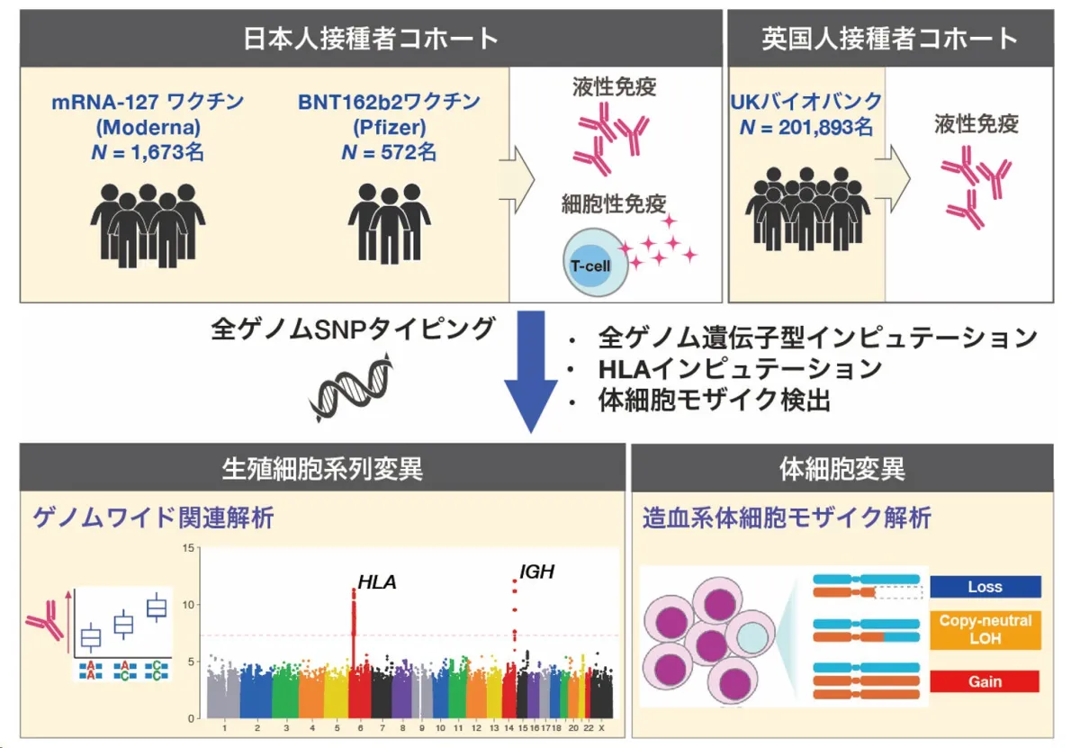 東京大学大学院医学系研究科遺伝情報学の研究チームは、COVID-19ワクチン接種者を対象にその遺伝子分析を行い、免疫獲得に関連する遺伝子を特定しました。ワクチン接種による免疫反応は、主に抗体価とT細胞の活動に依存していますが、これらの反応の獲得能に関与する遺伝子を解明することが目的です。