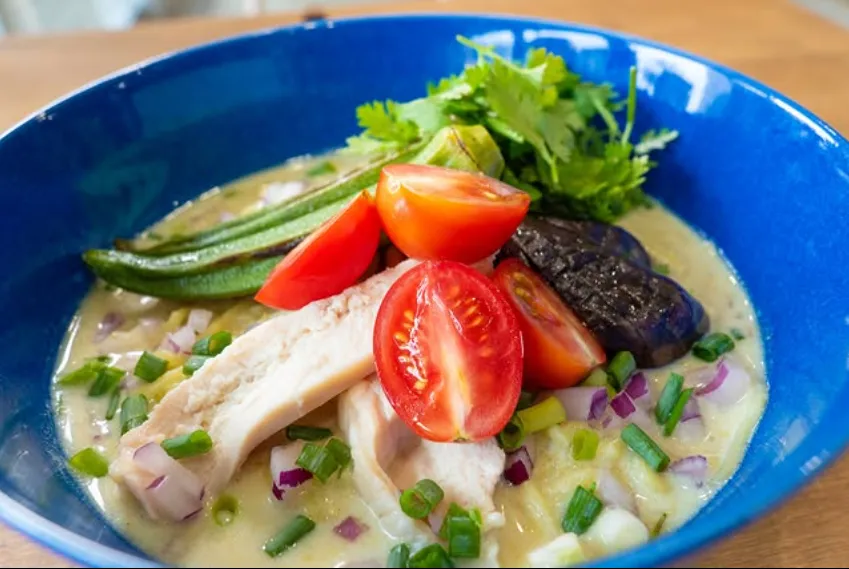 スパイシーなグリーンカレー風のスープに、丁寧に低温調理された鶏肉と新鮮な焼き野菜がトッピングされた一品。最後に残ったスープにご飯を加えると、更に旨みが引き立ちます。