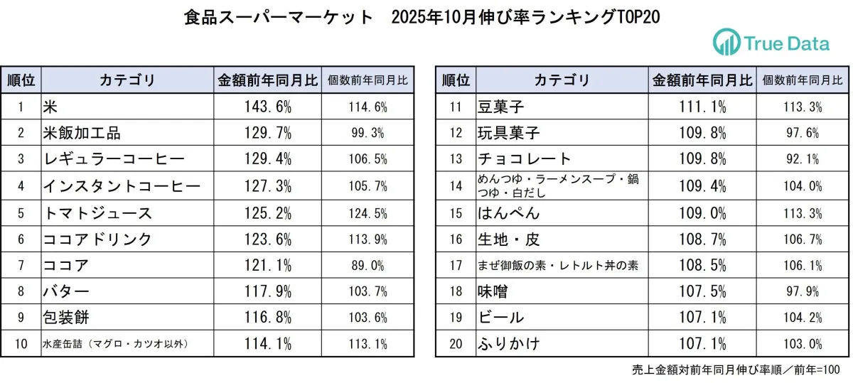 これらの売上データは、全国のドラッグストアと食品スーパーマーケットのPOSデータを基に、True Dataが集計したものです。2025年10月1日から31日までのデータをもとにしており、買い物指数が示す通り、消費者の購買行動は確実に変化しています。