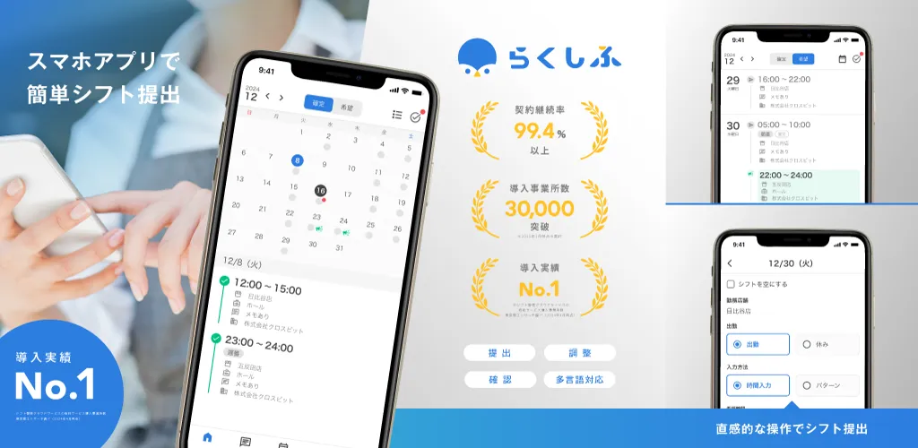 クロスビットは「100年先も続く、働くを支える」というミッションのもとに、クラウドシフト管理を可能とする「らくしふ」を提供しています。このシステムは、LINEを利用したシフト提出や通知機能を特色としており、使い慣れたツールのおかげで高い操作性を実現しています。また、希望シフトの自動集約や法令対応の支援、一元管理機能など、多様な業種に対応した機能を完備しています。