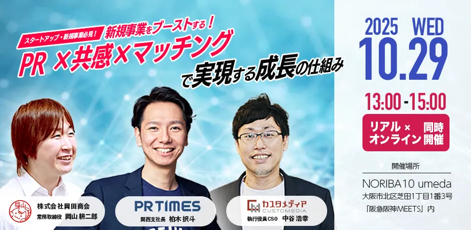 2025年10月29日(水)、大阪の梅田エリアのイベント施設であるNORIBA10 Umedaにて、株式会社カスタメディア、株式会社PR TIMES、株式会社岡田商会の三社が共催するセミナー「新規事業をブーストする!PR×共感×マッチングで実現する成長の仕組み」が開催されます。このセミナーは、スタートアップや新規事業の立ち上げに携わる方々に向けて、PRや共感、マッチングを通じたビジネス成長の秘訣を学べる貴重な機会です。