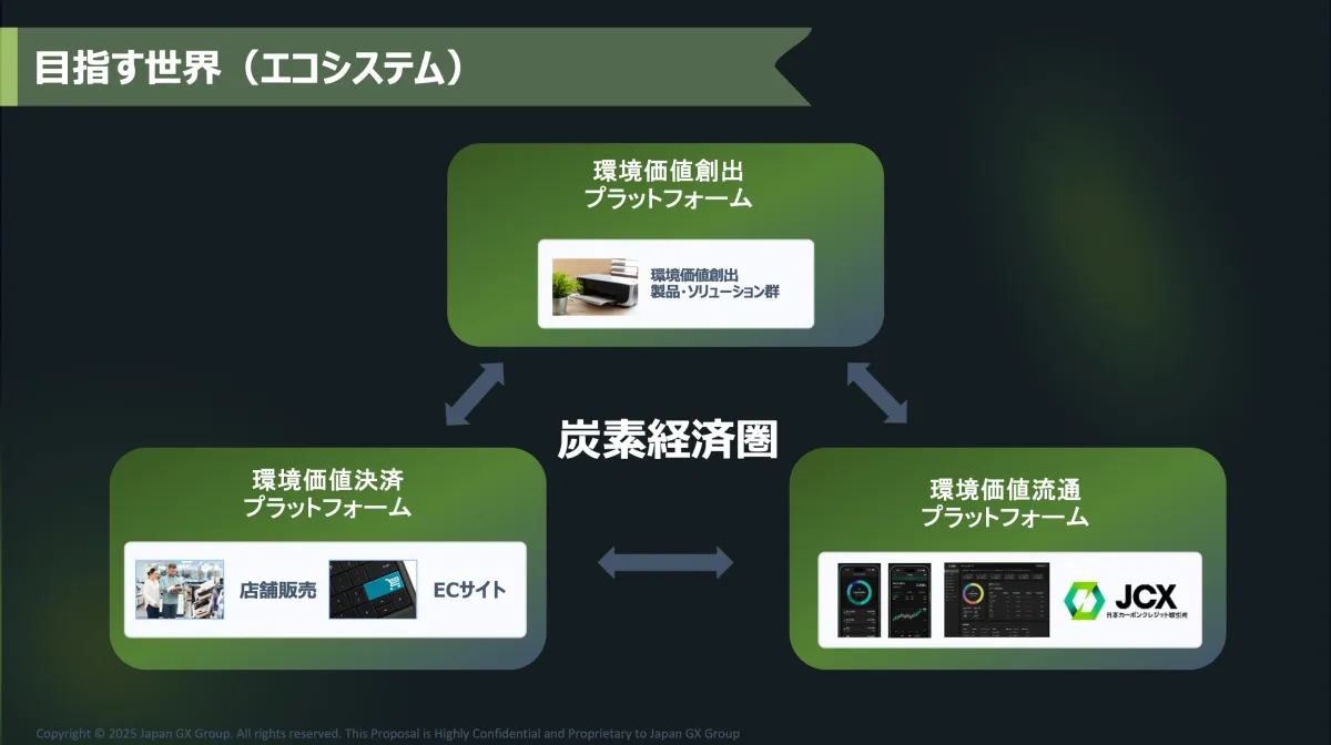 JGXが提案した事業プランは、「環境価値の経済的インセンティブを駆使し、企業価値の向上と個人の行動変容を同時に促進する炭素経済圏の確立」である。このプランは、環境への配慮を促すと同時に、経済的なインセンティブを設けることで、より多くの人々が積極的に環境保護活動に関与できる仕組みを目指している。