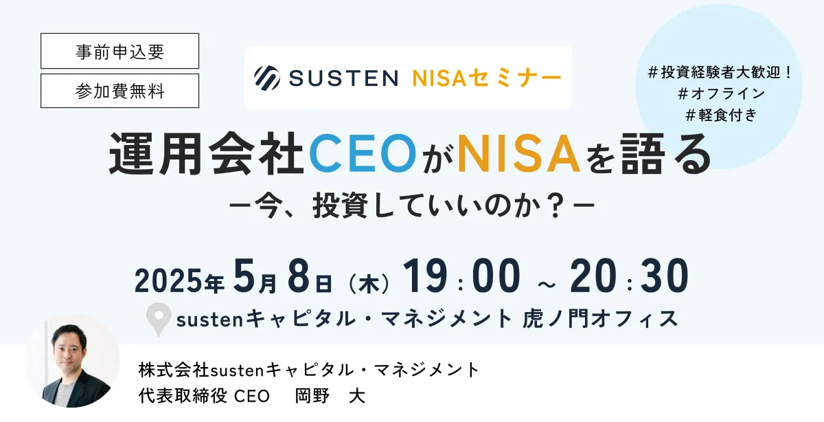 資産運用を自動化するサービス『SUSTEN(サステン)』を運営するサステン・キャピタル・マネジメントが、5月8日(木)に特別セミナーを開催します。このセミナーでは、運用会社のCEOである岡野大氏と山口雅史氏が登壇し、初心者から経験者まで広く参加できる内容を提供します。