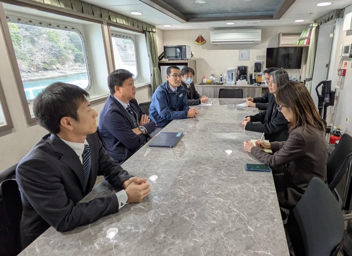 当日は、練習船「鳥羽丸」の見学に加え、学生がAIやIoTを活用した実績を発表しました。これに対し、ワン首席領事は質疑応答を通じて、学生たちの理解や実力を深く称賛しました。日本の教育機関としての存在意義や、今後の国際的な人材育成についても意見交換が行われました。