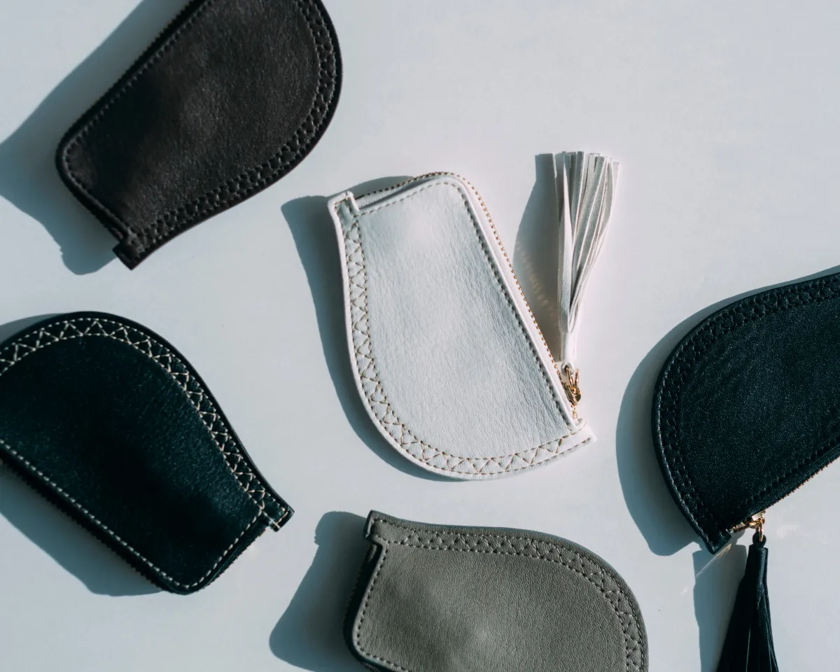 このキーコインケースは、ホワイト、ブラウン、グレー、ブラック、そしてホワイトステッチのブラックの5色展開です。ホワイトは無染色の生まれたての素肌のようなレザーで、残る4色は日常に溶け込む使いやすいカラーが特徴です。