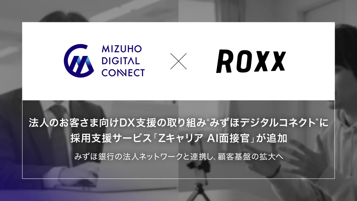 株式会社ROXX(東京・新宿、代表取締役社長:中嶋汰朗)が、新たに採用支援サービス『Zキャリア AI面接官』を、みずほ銀行とみずほリサーチ&テクノロジーズが推進する法人向けDX支援プログラム『みずほデジタルコネクト』に加えたことを発表しました。この提携により、ROXXは今までサービスを提供できなかった顧客企業へも届きやすくなり、企業の成長に貢献します。