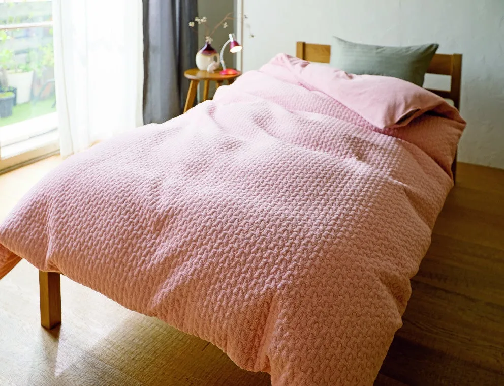 今回発売される「綿キルトケットにもなるふんわりあったか寝具カバー」は、その名の通り、掛け布団カバーとしても、春や秋にはキルトケットとしても使用可能な2通りの使用が可能です。これは寒い冬の時期には、片面に細かなキルティングが施されており、わた入りになっているため、暖かさが抜群です。