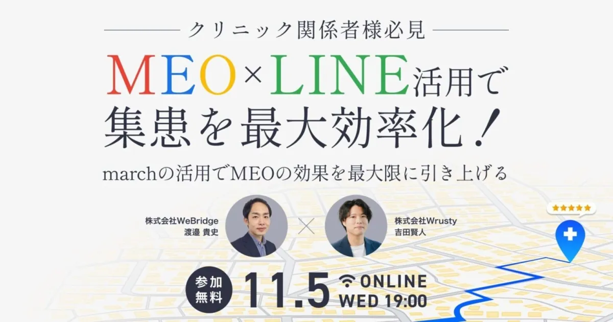 業界のデジタル化が進む中、医療機関の集患対策がますます重要になっています。2025年11月5日、株式会社Wrustyと株式会社WeBridgeが共催する無料オンラインセミナーが開催されます。このセミナーでは、MEO(Map Engine Optimization)とLINEを活用した集患施策について、お話をさせていただきます。
