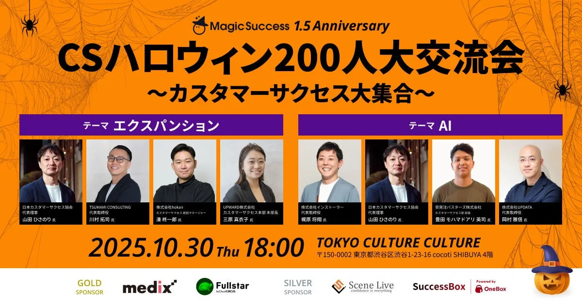 株式会社メディックスが、株式会社UPDATA主催の「CSハロウィン200人大交流会~カスタマーサクセス大集合~」にGOLDスポンサーとして協賛することが決定しました。このイベントは、カスタマーサクセスの分野に特化した交流の場として、多くの業界関係者が集まる貴重な機会です。