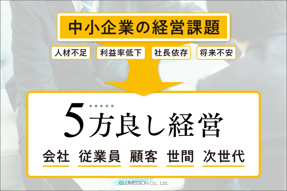 ルミッションが提唱する「5方良し経営」は、企業経営を以下の五つの視点から考えるアプローチです。