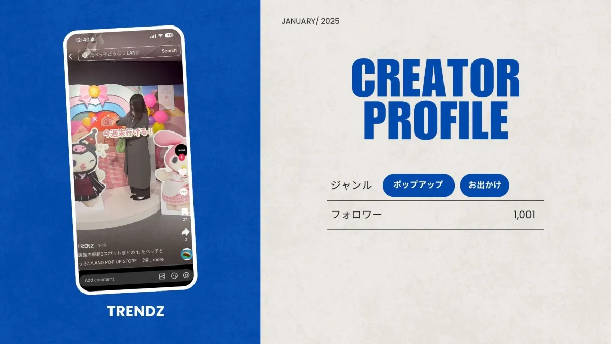 「TRENDZ」は、ポップアップイベントやお出かけに特化した情報を発信するメディアで、これまでに再生回数15万回を超える動画も制作してきました。彼らの強みはお出かけ分野にあり、新しいスポットやイベントに素早くアクセスし、その魅力を視覚的に伝えることで、多くのフォロワーを集めています。現在も1,001人のフォロワーがいる彼らのアカウントには、魅力的なコンテンツが豊富に掲載されています。