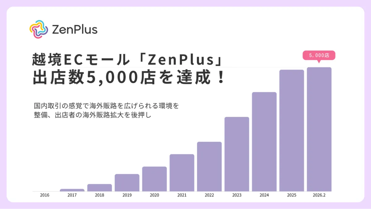 越境EC市場における代表的な存在であるZenGroup株式会社が運営する「ZenPlus」は、出店数が2026年2月に5,000店に達しました。これは、2016年12月のサービス開始から約7年での進展であり、特に2023年9月には3,000店、2025年1月には4,000店を記録しました。この短期間に1,000店の増加があったことは、日本企業の海外進出を希望するようなニーズが高まっている証拠です。