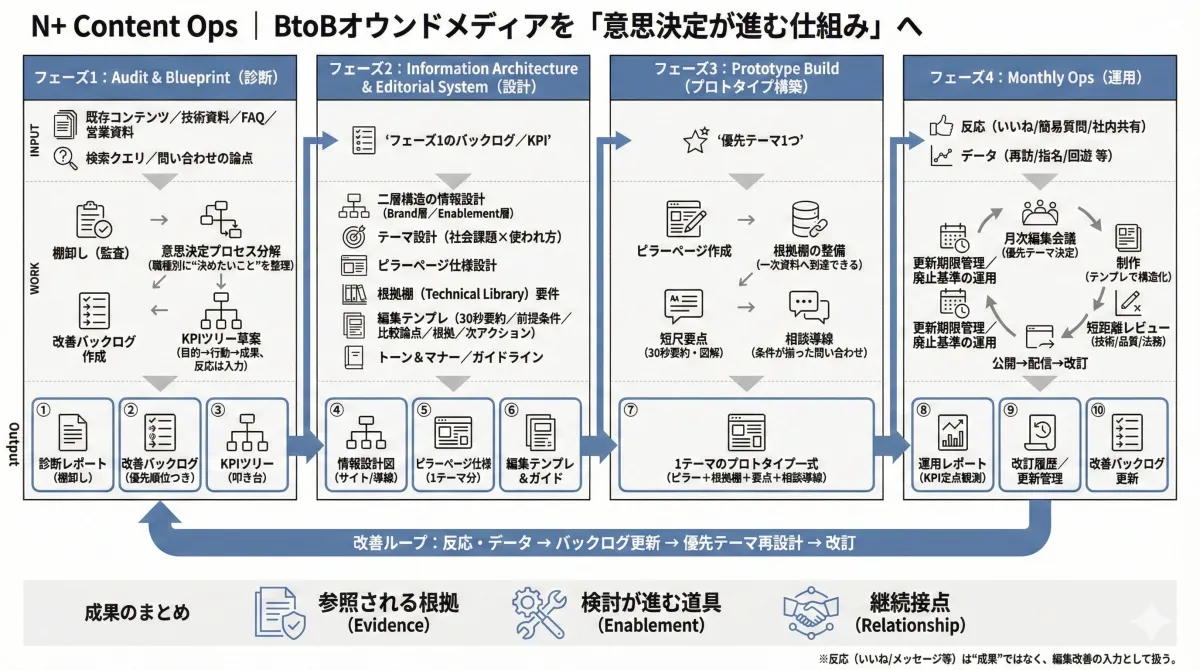 「N+ Content Ops」では、サービス提供の初期には既存コンテンツの監査や意思決定プロセスの整理が行われ、その後、KPIの設計や情報設計が進められます。この一連のプロセスは約4〜6週間のLaunch Sprintでスタートし、その後Monthly Opsにより継続的に改善されます。