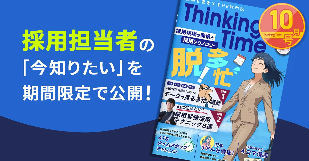 「Thinking Time」vol.3は、採用担当者や経営者が今知りたい情報をコンパクトにまとめたコンテンツです。採用現場での多忙を解消するための様々な手法や実践的な知識を得るために、ぜひダウンロードしてみてください。