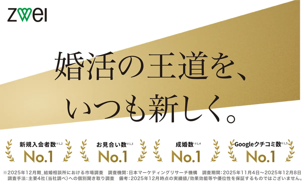 結婚相談所の中で最多の店舗数を誇る「ZWEI(ツヴァイ)」。この会社は、2025年の日本マーケティングリサーチ機構の調査で、成婚数や新規入会者数、お見合い数、Googleクチコミ数の4部門でNo.1の評価を得ました。