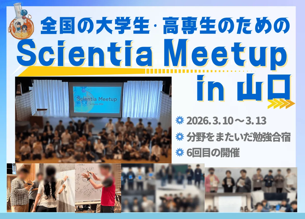 2026年3月10日から4日間、山口県YMfg維新セミナーパークにて、理系大学生や高専生を対象とした「Scientia Meetup in 山口 6th」が開催されます。主催するのは学生団体「Scientia Meetup」、その代表を務めるのは東京大学工学部の4年生・山田吏月さんです。今回は6回目となるこの合宿、経済的な理由で参加を考えた学生たちを支援するために、クラウドファンディングに挑戦します。