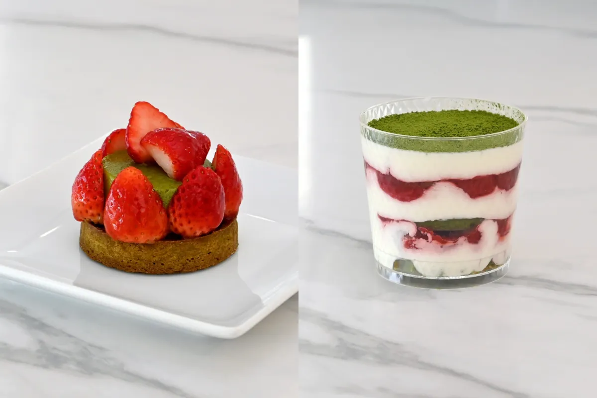 「とちあいか」は、2018年に開発された栃木県オリジナルの苺の品種です。この苺の特徴的な点は、縦にカットした際にハート型に見える断面を持つこと。そのかわいらしい見た目と、しっかりとした果肉感、豊かな果汁は魅力です。また、ややマイルドな酸味と感じやすい甘みで、多くの人々に愛されています。当店では、苺と抹茶の両方の風味が際立つようにバランスを考慮しながら、2種類のスイーツを開発しました。