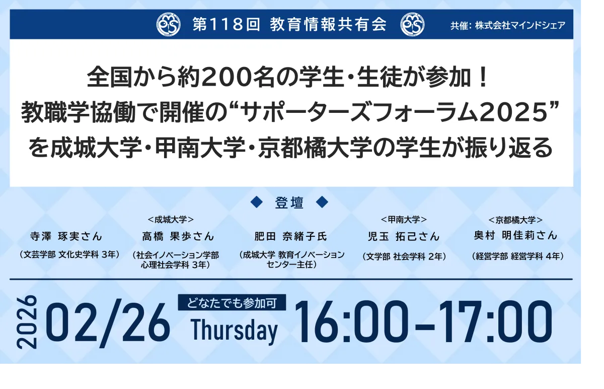 教育に関わる様々な取り組みを共有する第118回教育情報共有会が、2026年2月26日に行われます。このイベントは、全国から約200名の学生や生徒が参加した「サポーターズフォーラム2025」を振り返るもので、成城大学、甲南大学、京都橘大学の学生たちが登壇します。昨年11月に開催されたサポーターズフォーラムでは、学生同士が交流し、学び合いの場が形成されました。その様子を具体的に振り返りながら、今後の展望についても議論します。