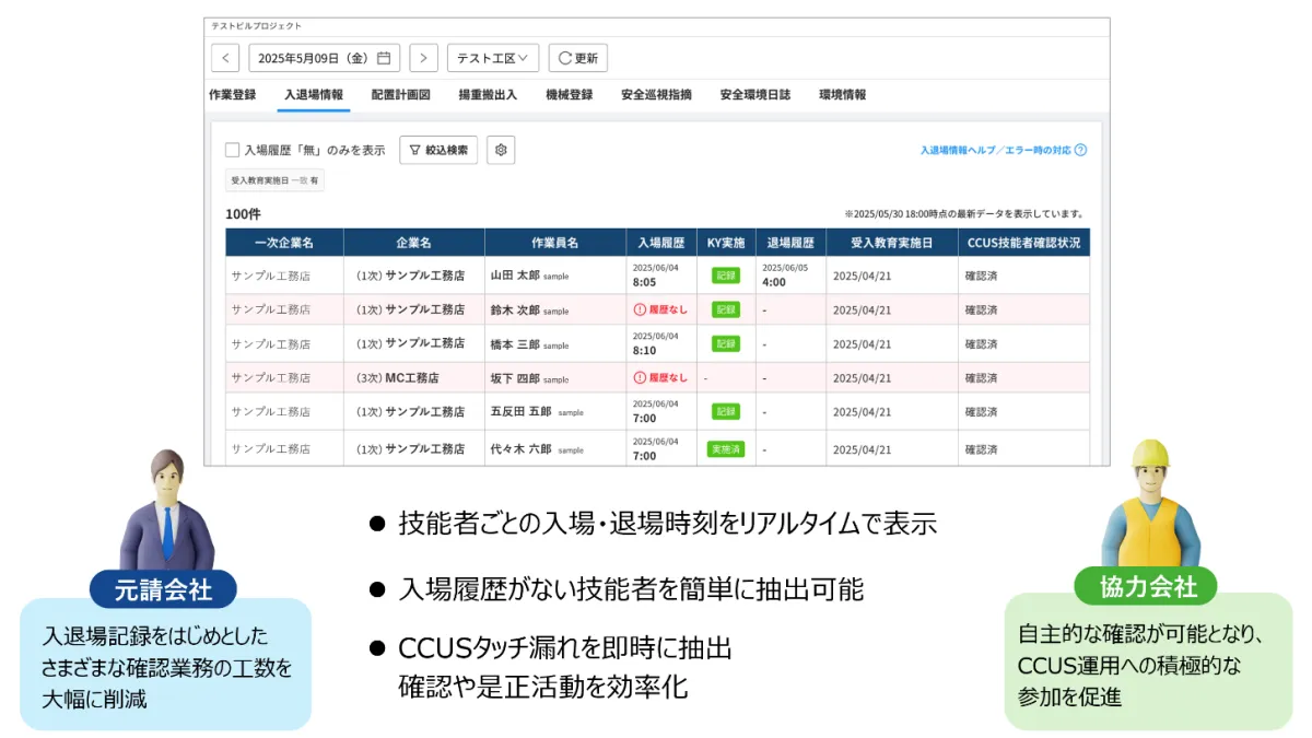 入退場情報機能の最大の利点は、協力会社が元請会社の担当者と同じ情報を直接確認できるようになった点だ。これにより、情報の共有が進み、必要に応じた働きかけが行いやすくなる。結果として、元請企業の担当者が抱えていた業務負担が軽減され、より可以の向上へとつながるのだ。