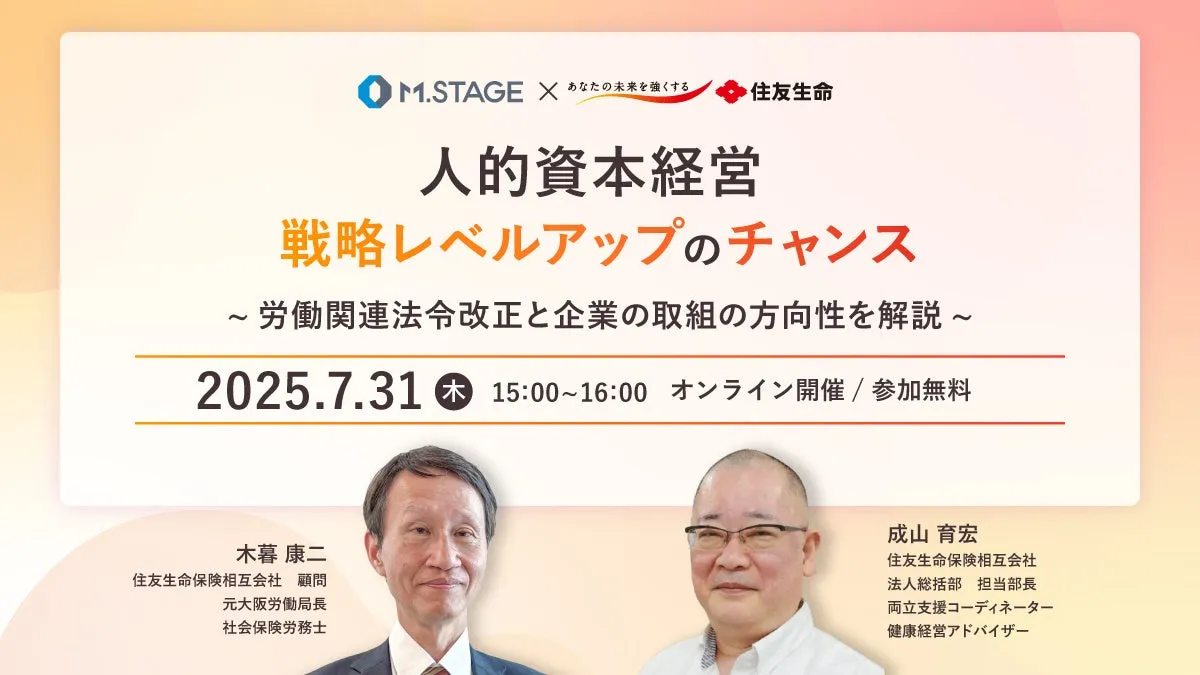 東京都品川区に本社を置く株式会社エムステージは、2025年7月31日(木)15時より、住友生命保険相互会社と共催で、オンラインウェビナー「人的資本経営戦略レベルアップのチャンス -労働関連法令改正と企業の取組の方向性を解説」を開催します。