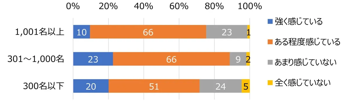 調査結果によれば、社内コミュニケーションに課題を感じている企業は非常に多く、大企業の76%、中堅企業の89%、中小企業の71%がそれを認識しています。特に大企業や中堅企業では、部門間の関係性において問題が顕著であることが分かりました。この点における課題は、部門同士の協力や情報共有の不足に起因していると考えられます。
