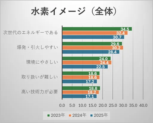 調査結果によると、水素社会に関する認知度は昨年よりも2.9%減少し、26.0%となったことがわかっています。これは、SDGsの認知度が71.1%であるのに対し、水素社会に関しては約4人に1人が知らないという状況を示しています。これは、水素社会の重要性が広まる中で、一般の理解が追いついていないことを示しています。