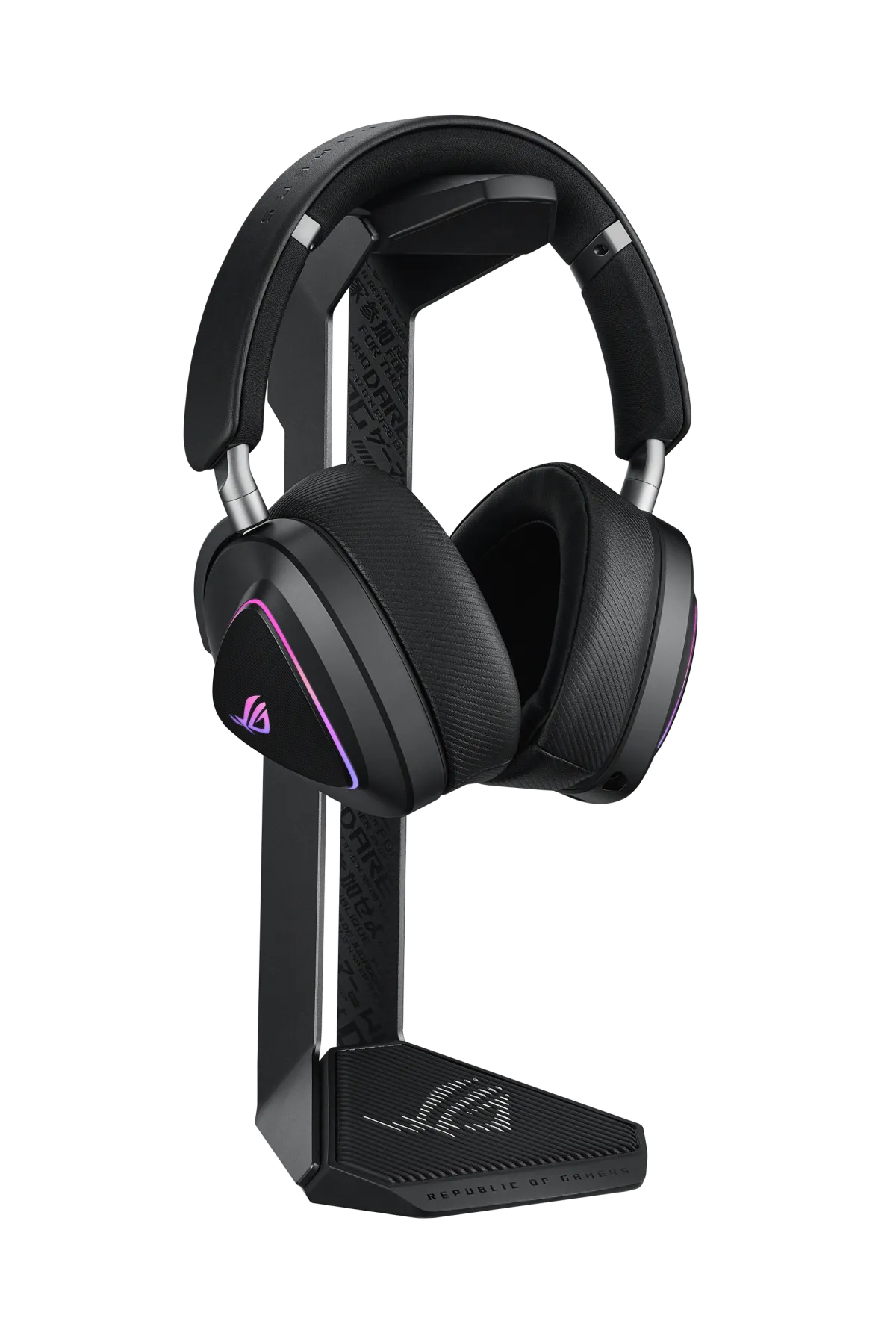 特に目を引くのが、ROGを象徴する際立ったテキストパターンと銀色のロゴです。この大胆なデザインは、他のROGデバイスとの統一感を演出し、ゲーミング環境全体を引き立てます。さらに、スタンドは安定性を重視した構造で、滑り止めベースが追加されています。これにより、使用中も安心してヘッドセットを置くことができます。