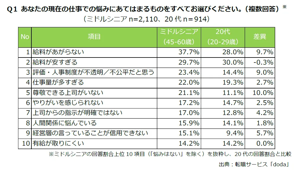 調査結果から見えてきたのは、ミドルシニアが現職に対して抱く悩みです。最も多い悩みとして挙げられたのは「給料があがらない」というもので、回答者の37.7%がこれを選びました。さらに、「給料が安い」と感じる人も29.7%、評価制度が不透明だとする人も23.4%おり、給与面や評価制度に対する不満が顕著です。特にミドルシニア層は、20代と比べて上司に対する不満も目立ち、尊敬できる上司がいないという回答が目立ちました。