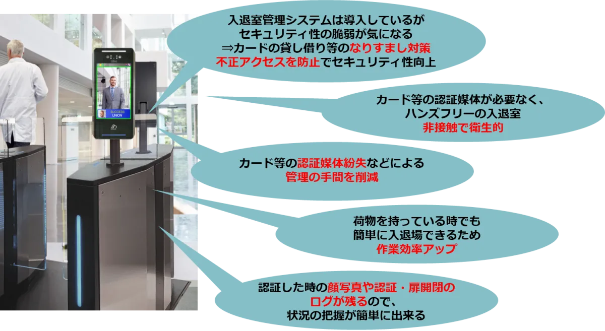 自体が非接触なため、衛生管理が重要とされる環境、特に医療機関などにおいてそのメリットは大きいです。さらに、顔認証は高性能なアルゴリズムに支えられ、1秒以内の高速認証を実現しています。ウォークスルー認証に対応しているため、利用者は最大4メートル離れた位置からでも正確に認識されます。この技術により、動きながらもスムーズに入室が可能となります。