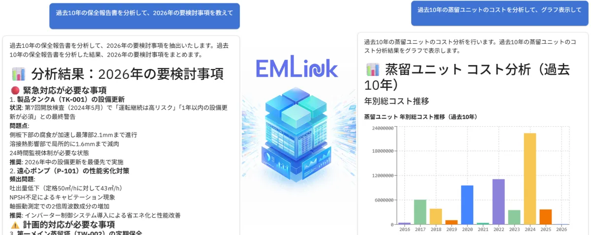 EMLink Intelligenceの導入は、保全部門の業務を大きく変革しています。AIの助けを借りて、レポート作成や計画立案の作業から、職員は本来の業務である「判断」に集中できるようになりました。