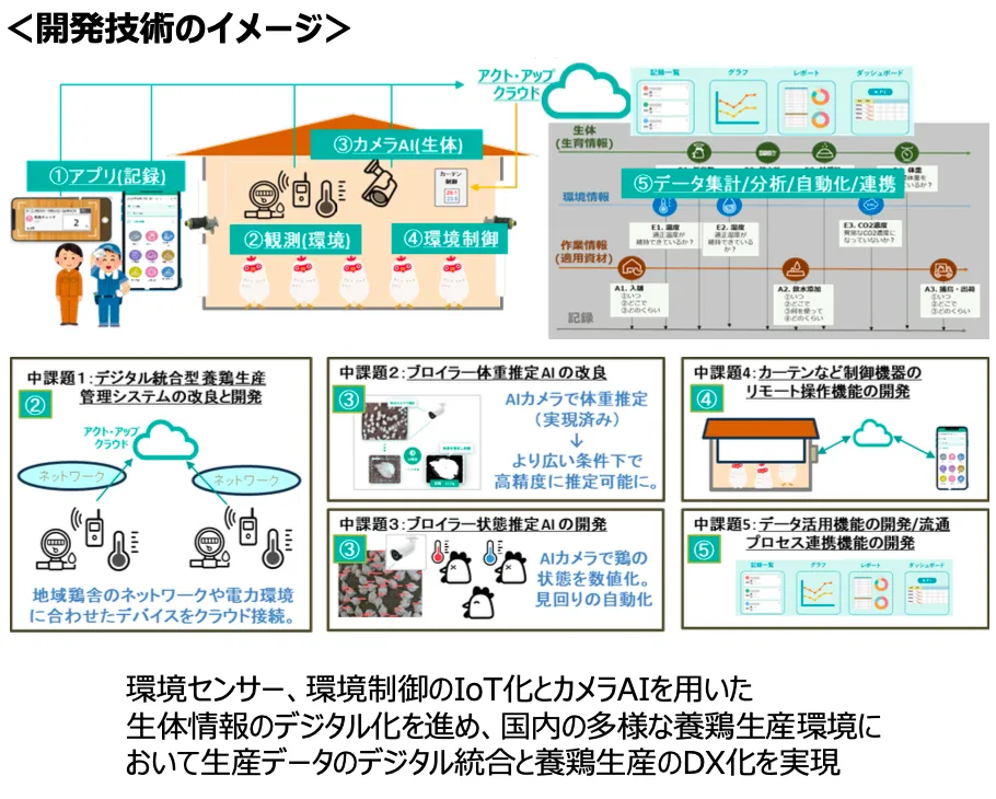 採択された事業名は「スマート農業技術の開発・供給に関する事業」で、特に「デジタル統合型養鶏生産管理システム」の開発と供給に焦点を当てています。このシステムは、養鶏ブロイラーの生産省力化と生産量の向上を実現するために、様々な技術要素を統合しています。