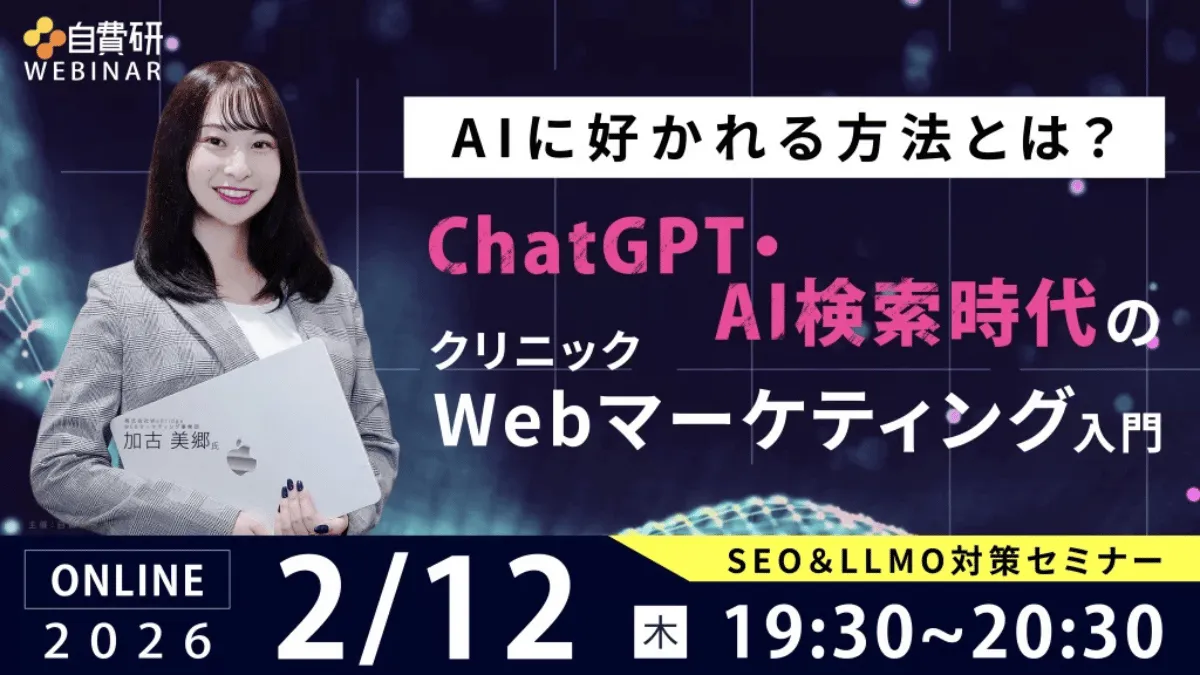 生成AIの発展により、私たちの集客方法は大きく変わりつつあります。医療従事者として、今後の集患戦略を見据え、この変化に適応することが求められます。そこで、2026年2月12日(木)に、オンラインで開催されるセミナー「AIに好かれる方法とは?ChatGPT・AI検索時代のクリニックWebマーケティング入門」をご紹介します。