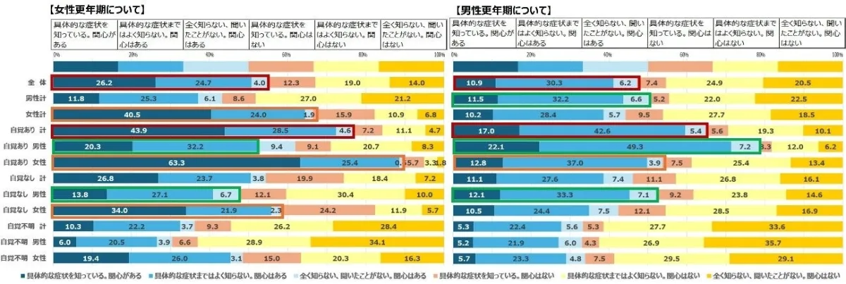 調査結果によると、「女性の更年期」に対する認知は女性91.3%、男性72.7%、関心はそれぞれ66.4%、43.2%となっており、男性に対する更年期への関心も増加しています。一方で、「男性の更年期」に関しては、男性70.9%、女性75.8%が認知しており、関心は男性50.3%、女性44.3%に達しました。これは、男性が更年期を自身の問題と捉え始めている証拠と言えるでしょう。