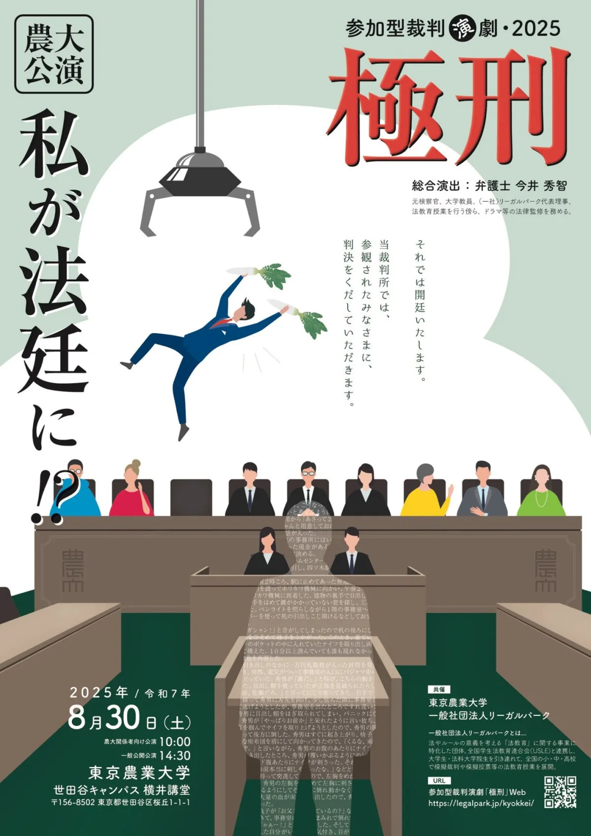 2025年8月30日、東京農業大学の世田谷キャンパスにて開催される参加型裁判演劇「極刑」の上演が期待されています。この作品は、観客が直接裁判員となり、実際の裁判を体験することができるユニークな形式を取っています。