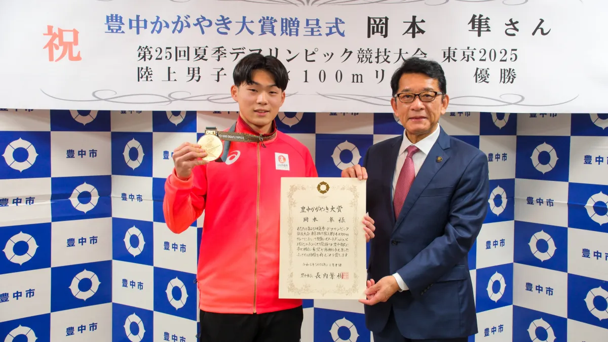2025年に東京で開催される第25回夏季デフリンピック競技大会において、本市の岡本隼選手が陸上男子400mリレーで見事金メダルを獲得しました。この快挙を称え、豊中市の長内繁樹市長から「豊中かがやき大賞」が贈呈されることが決まりました。